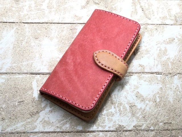 iPhone & android 手帳型 レザーケース プエブロ ピンク×ナチュラル 糸 ピンク