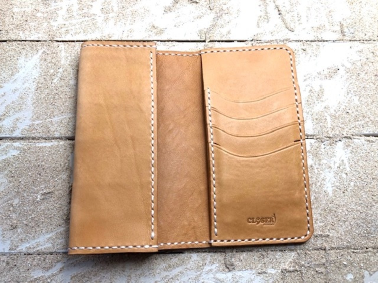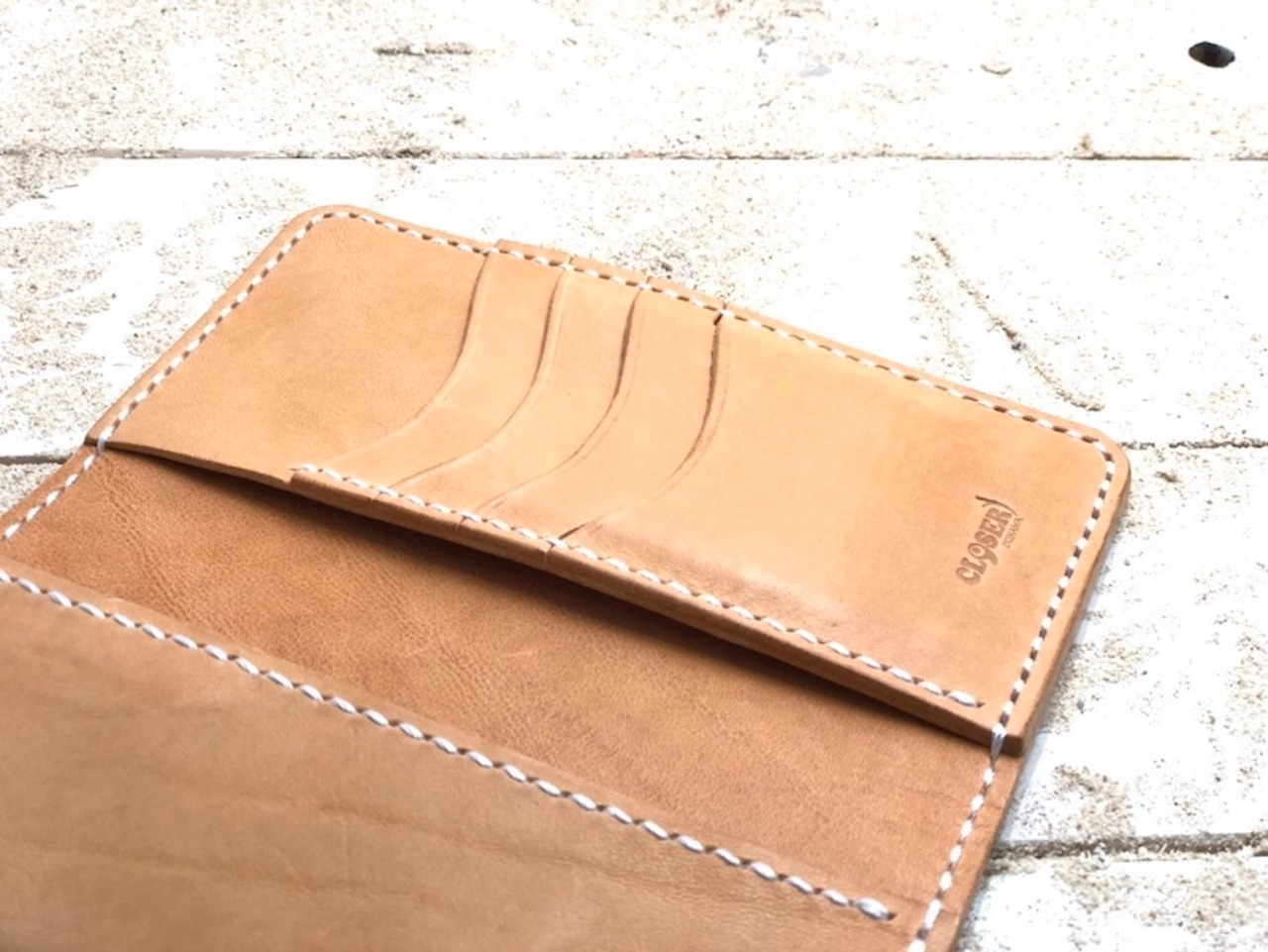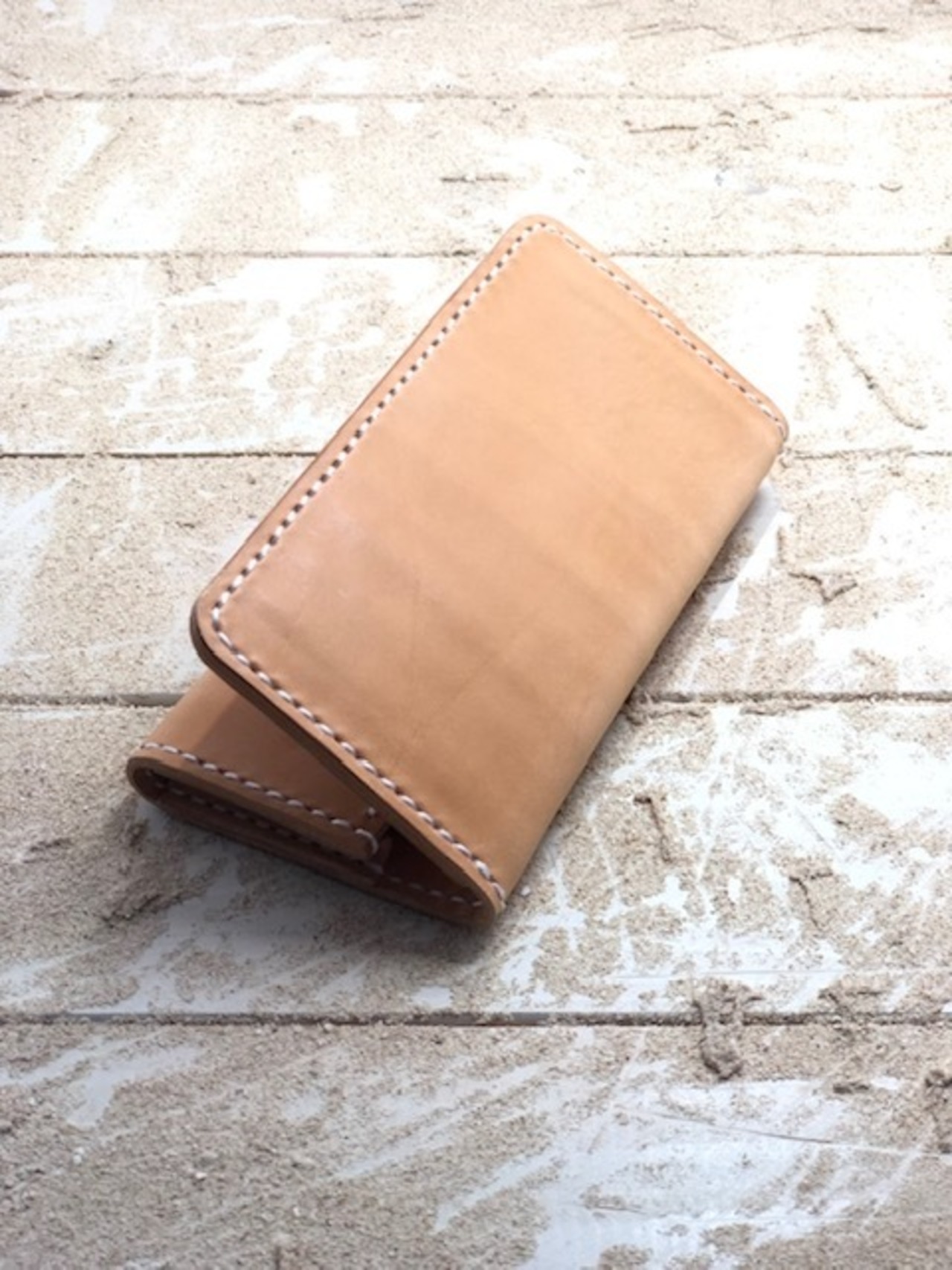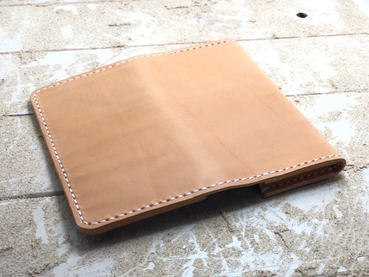 手縫い はじめに革に糸を通す穴を開け専用の糸を使い特殊な縫い方で仕上げます。ミシンに比べて見た目も良く、切れにくく丈夫に仕上がります。