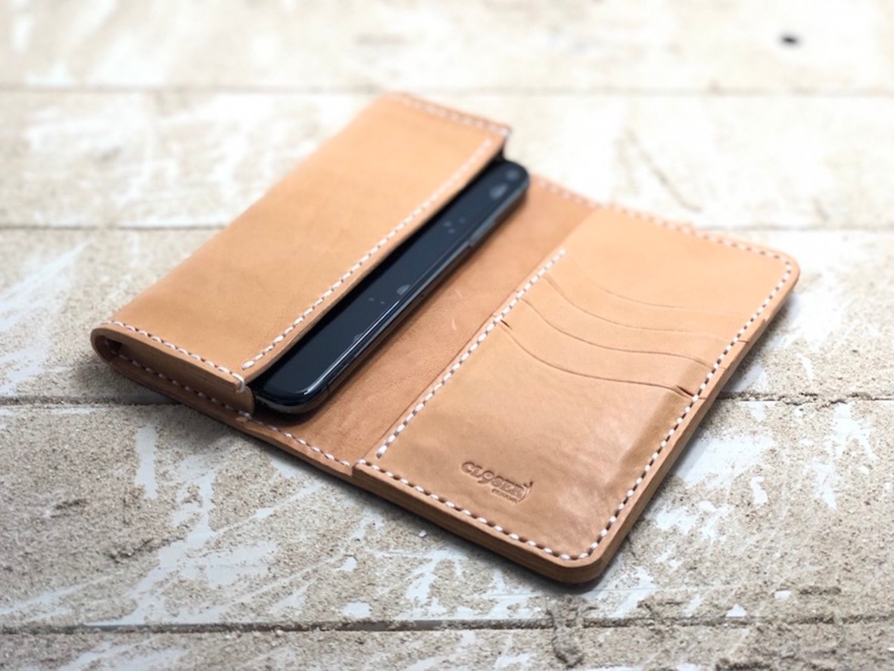 iphoneが落下しないようにしっかり計算し、取り出しやすい様にマチ付きにしました。